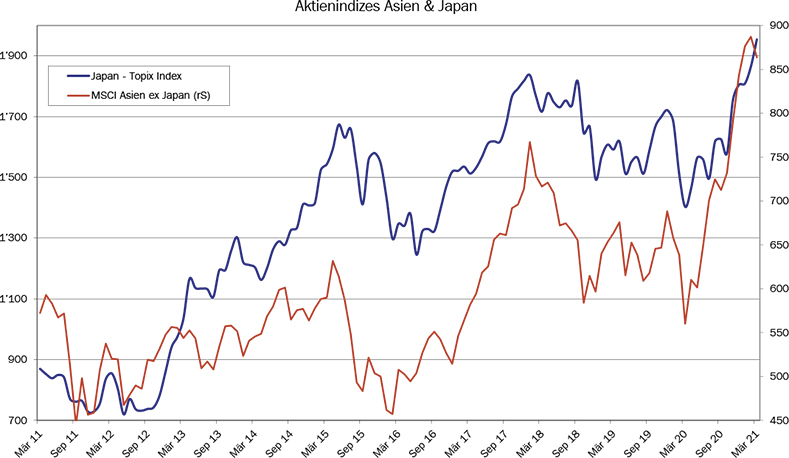 In den asiatischen Schwellenländern wurden im ersten Quartal etwas kleinere Brötchen gebacken. Nach dem eindrücklichen 2020 (Index +25%) brachte es diese Weltregion nun auf ein Plus von knapp 3%. Wir haben an den Positionen nichts verändert und sind daher weiterhin leicht übergewichtet.