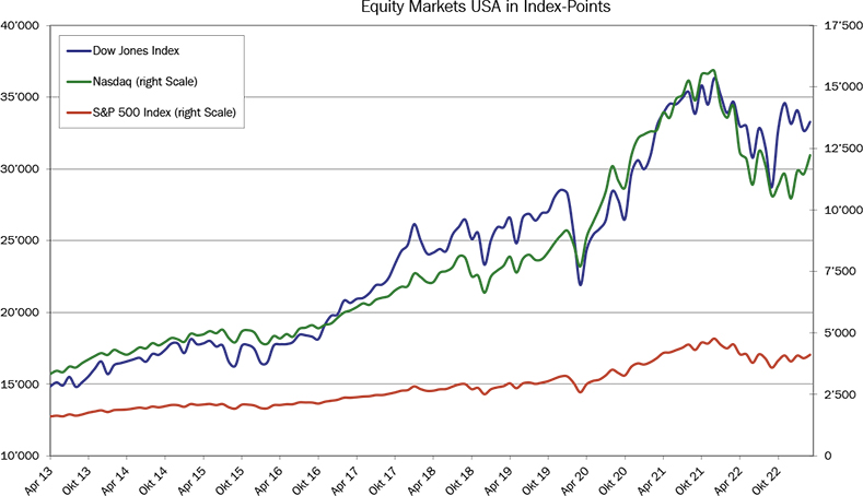 In the fourth quarter of 2022, sales per share of S&P 500 companies fell compared to the previous quarter for the first time since the outbreak of the pandemic. While the decrease is small, it could be an indication that earnings are coming under pressure. Based on the overall index, according to «Bloomberg», the market consensus was not expecting earnings per share growth at the moment. Given the numerous uncertainties and the not-cheap valuations, a wait-and-see attitude seems to be justified for US equities. We have made no changes in US equities in the past twelve-week period.